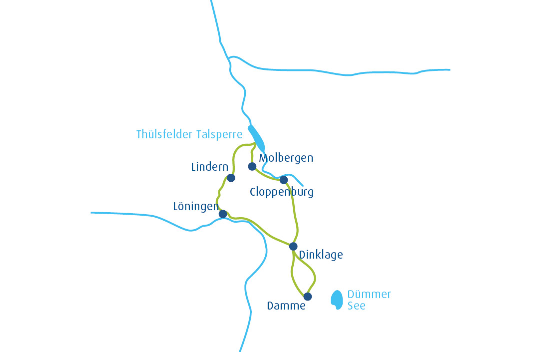Der Ausgangspunkt Ihrer Tour ist Cloppenburg, größte Stadt des Landkreises. Von dort aus starten Sie hre Radtour entlang des gut ausgeschilderten Knotenpunktnetzes. Dieses führt Sie zunächst durch die charmanten Ortschaften Molbergen und Dwergte, die mit ihrer norddeutschen Dorfstruktur und ländlichem Flair zum Verweilen einladen. Ein erstes Highlight erwartet Sie wenig später: die Thülsfelder Talsperre. Der künstlich angelegte Stausee ist nicht nur landschaftlich beeindruckend, sondern auch ökologisch wertvoll. Die umliegende Heide-, Moor- und Waldlandschaft beheimatet eine Vielzahl seltener Tier- und Pflanzenarten und steht unter